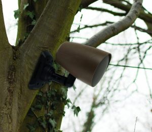 Monitor Audio says the satellite speaker’s horn-shaped enclosure helps the speaker to project sound into free spaces. The speaker can be spiked into the ground or it mounted to trees, walls, and other surfaces via an optional mounting bracket.