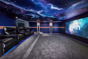 Based on the dimensions of the screen, TYM calculated the best seating location for the owner. The rest of the home theater design would revolve around this prime viewing spot. This would include a Dolby Atmos/DTS:X capable surround-sound system comprising Paradigm CI Elite in-wall and in-ceiling speakers and Anthem receiver. Additional seating in the form of blue bean bag chairs would occupy the floor in front of the main seating area. “Low to the ground, the bean bag seating would ensure that nothing would block the owner’s view of the screen,” Montgomery explains.