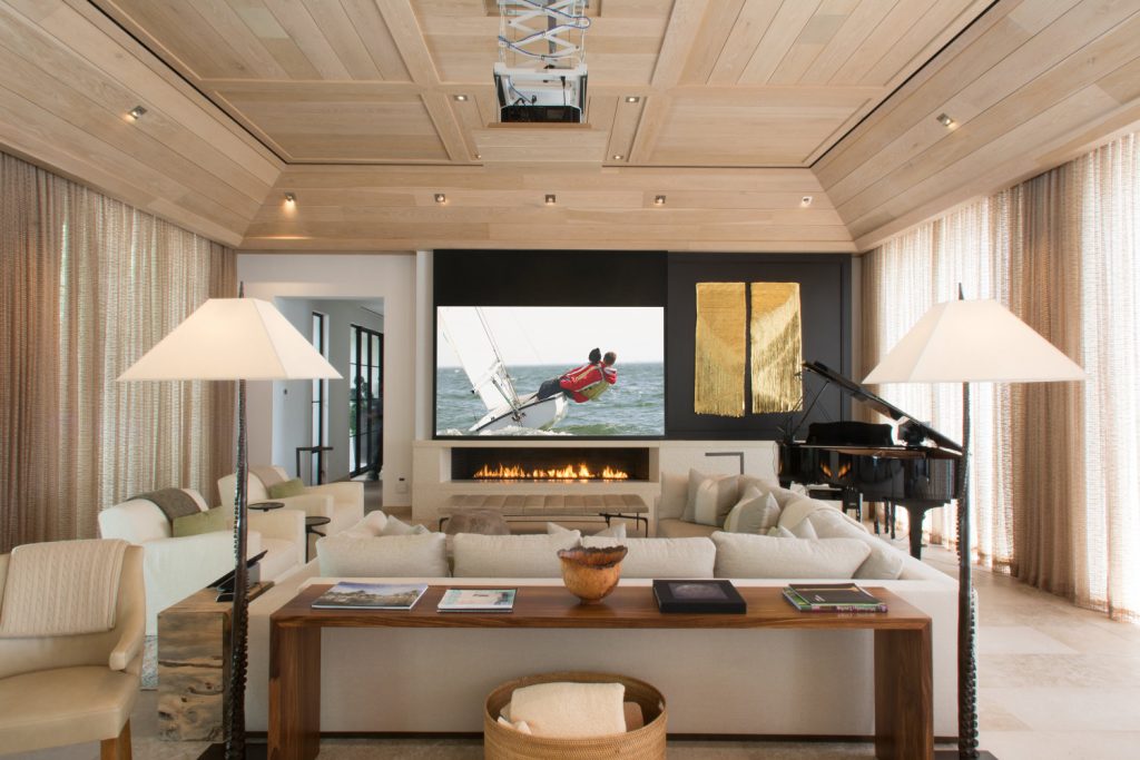 No surprise, the homeowner chose the largest of the screen options — a super-wide anamorphic screen measuring 155 inches (diagonal). A Sony 4K projector suspended from the ceiling throws football games and movies onto the Draper screen.
